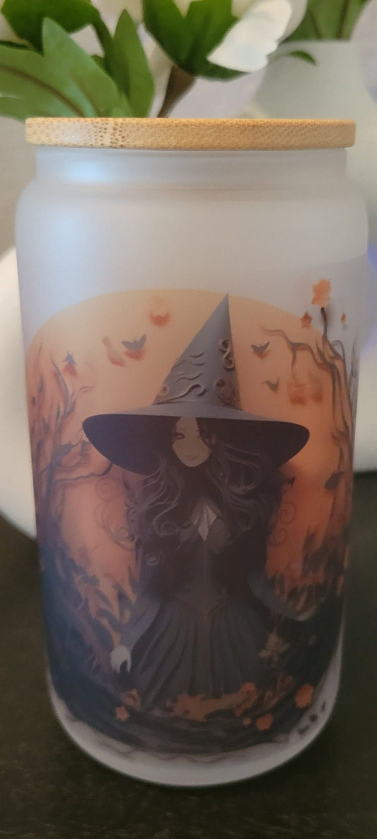 Spooky Witch Halloween Girl Witch Frosted glass can, 16 oz frosted glass with a bamboo lid and straw, frosted tumbler